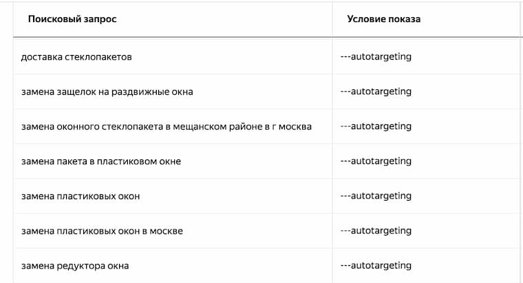 В примере ниже, для компании по замене окон нецелевыми запросами будут «доставка стеклопакетов», «замена защелок» и «замена редуктора».
